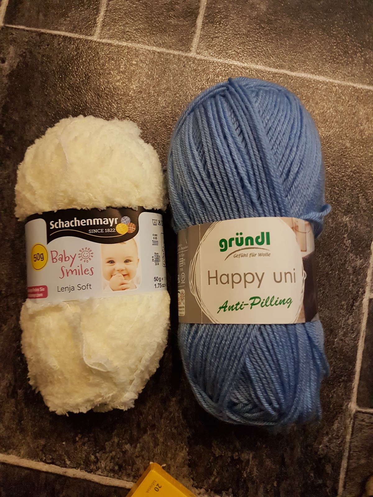 Do zrobienia tego kocyka potrzebowałam 3 motków błękitnej włóczki Happy uni firmy Gründl, jednego motka białej Baby Smiles / Schachenmayr i pół motka szarej Happy uni. Robiłam podwójną nitką drutami 4,5 KnitPro